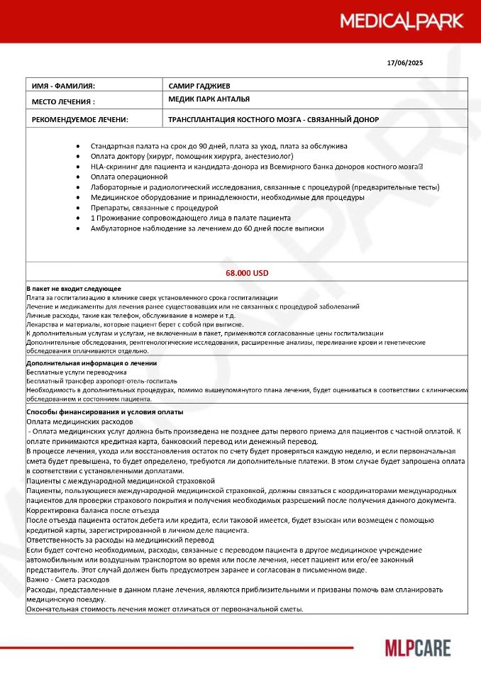 🏥 Для трансплантации костного мозга необходимо 75 000 долларов
